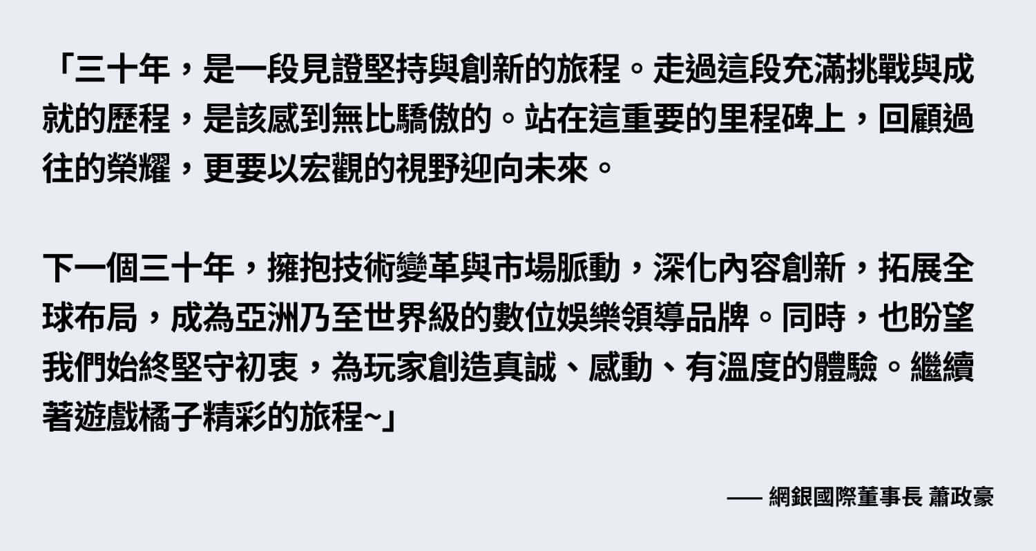 三十而立,對橘子來說,不只是時間的累積,更是一段關於夢想、創業與冒險的長跑。從四個人、一間工作室起步,一步步走到千人的泛娛樂集團,從遊戲拓展至內容創作、支付、資安、AI 發展與社會參與,即使還在路上,但我們始終相信,這片土地有值得被說出、被記住的故事,也有很多故事正在被寫下。