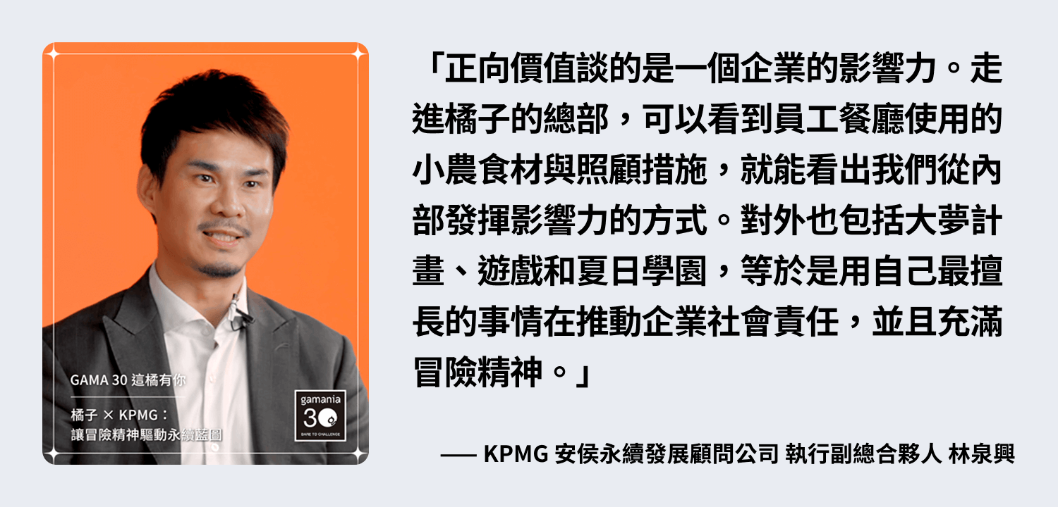 對橘子而言,「have a GOOD TIME」不只是用戶體驗,更是對員工與社會的承諾,從普橘島選用友善食材,到設立內湖第一家企業幼兒園,橘子始終以實際行動落實永續,參與,而非僅僅響應。